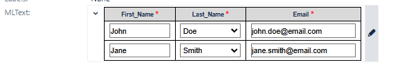 2. In the custom field, click </> Source button and create a table containing <input> and <select> tags (HTML example for input and select tags.txt)