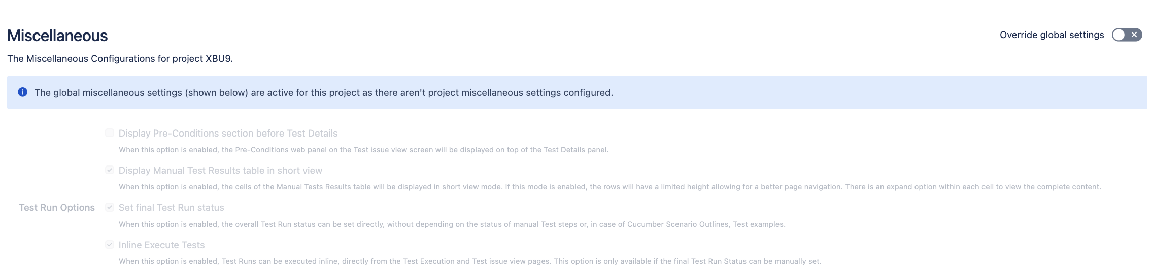 - Go to Jira Administration > Manage apps > Xray > Miscellaneous, and disable Project Settings: