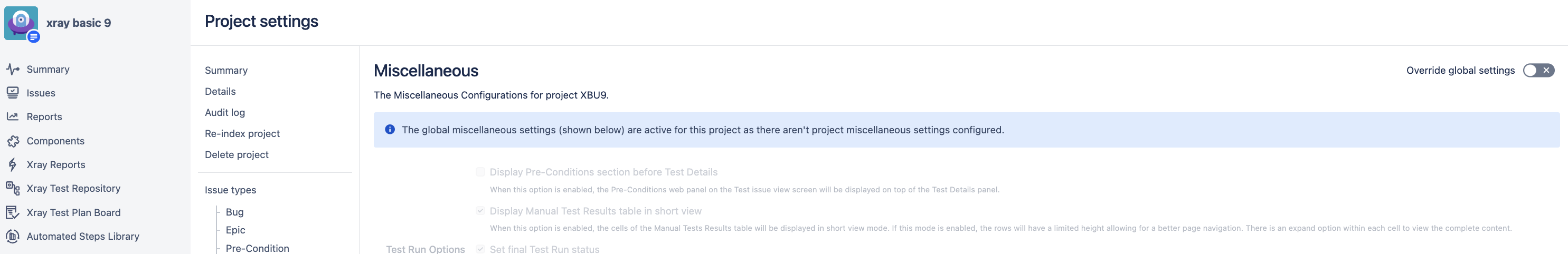 - Logged as an instance admin (Global admin), go to another Xray project (that is not allowed to override global settings), then go to Project settings > Xray Settings > Miscellaneous.