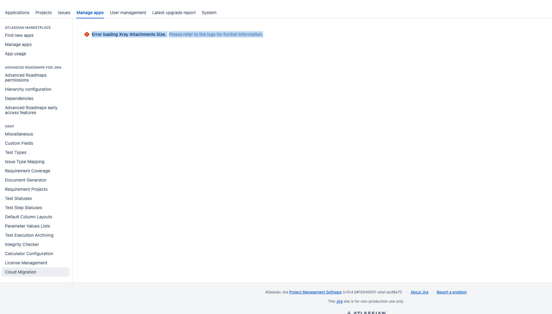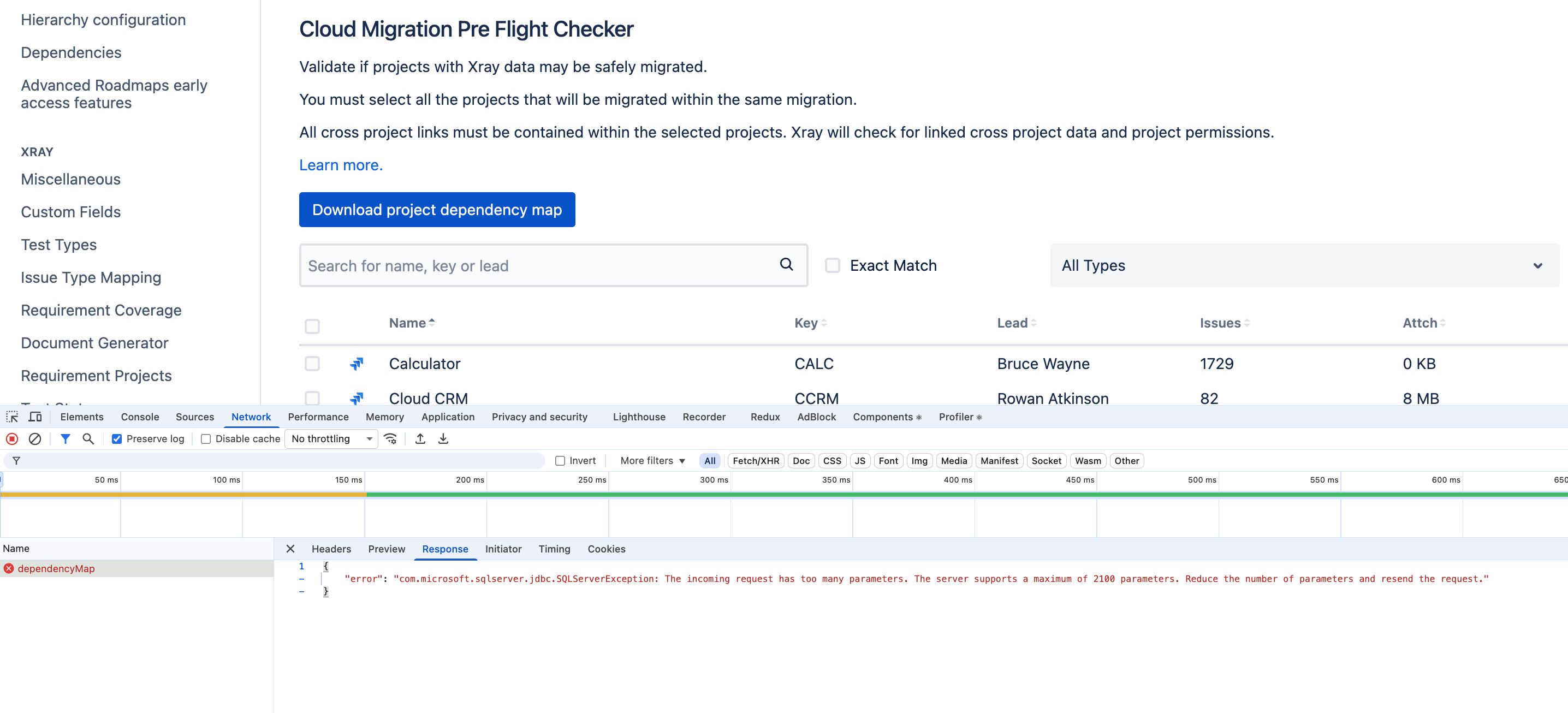 Xray pre-flight screen failes to load in Oracle or MSSQL databases when the instance has more than 1,000 and 2,100 projects respectively.