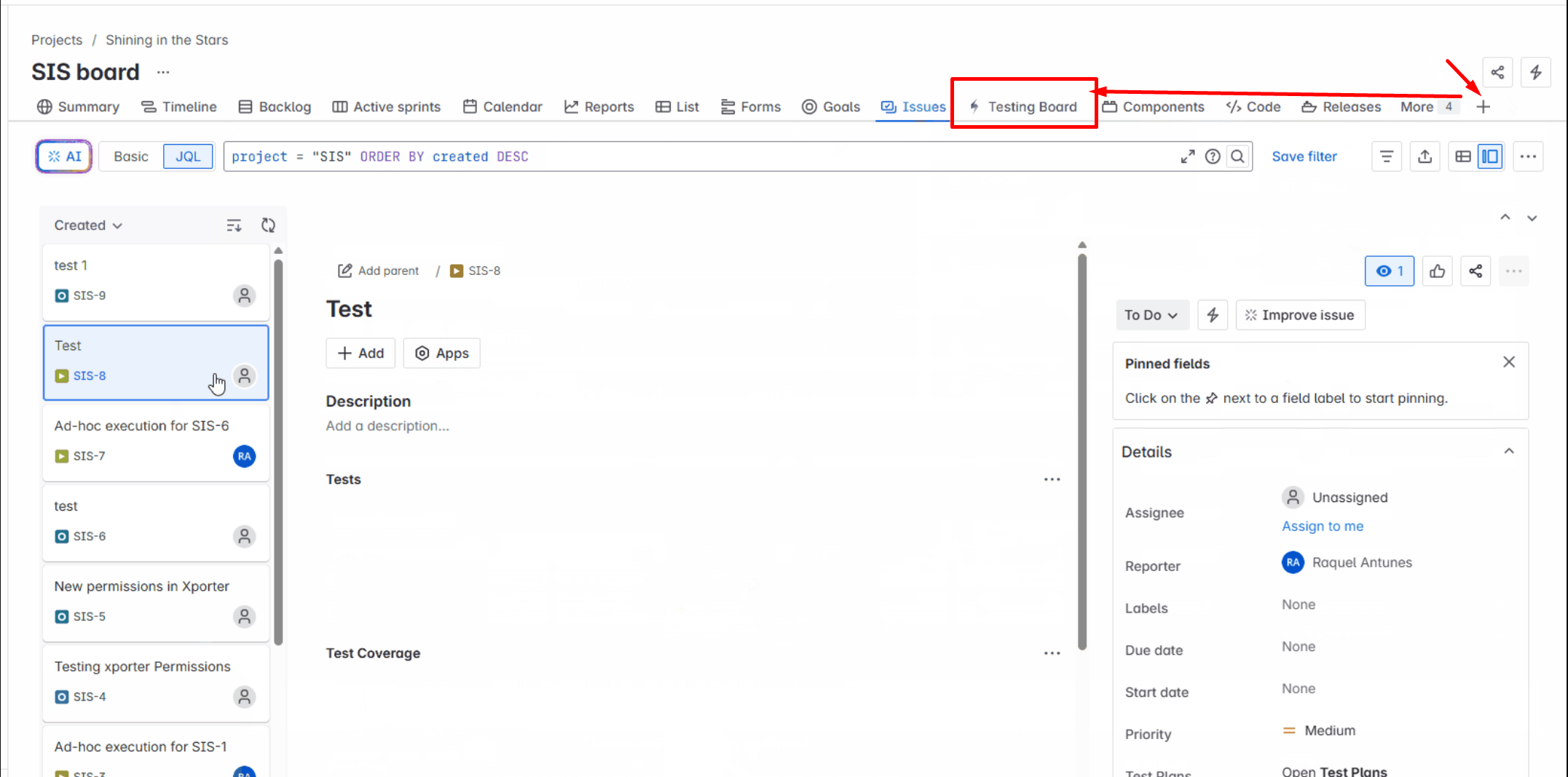 icon and include Testing Board in the Navigation menu