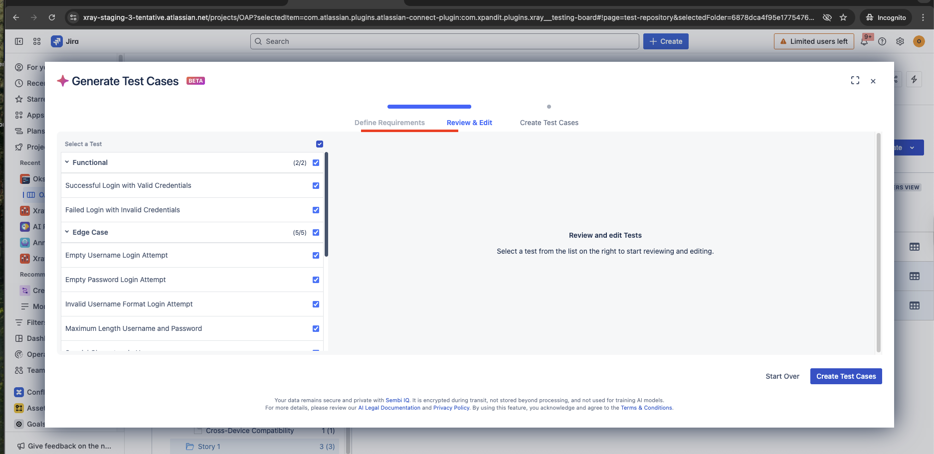 Go through the Test Case Generation feature until you reach the "Review & Edit" step. At the top, the "Define Requirements" is presented as a link, but clicking it does nothing.