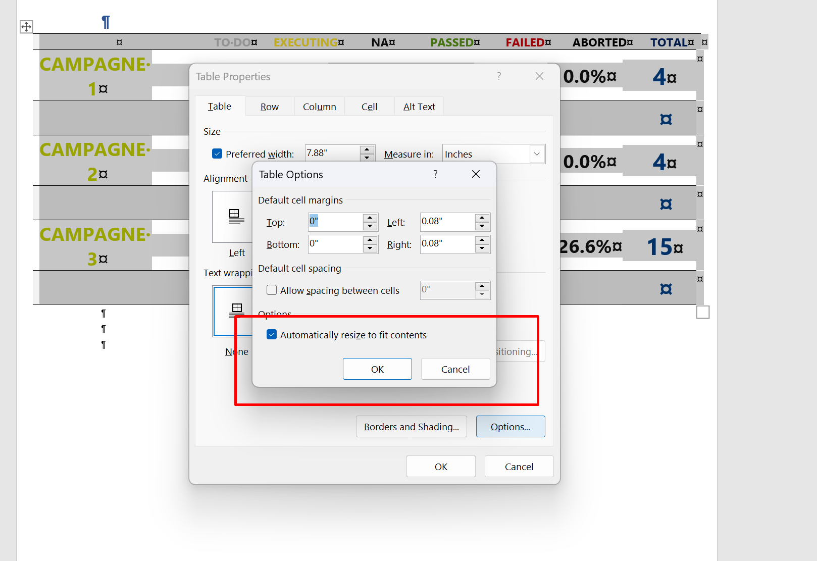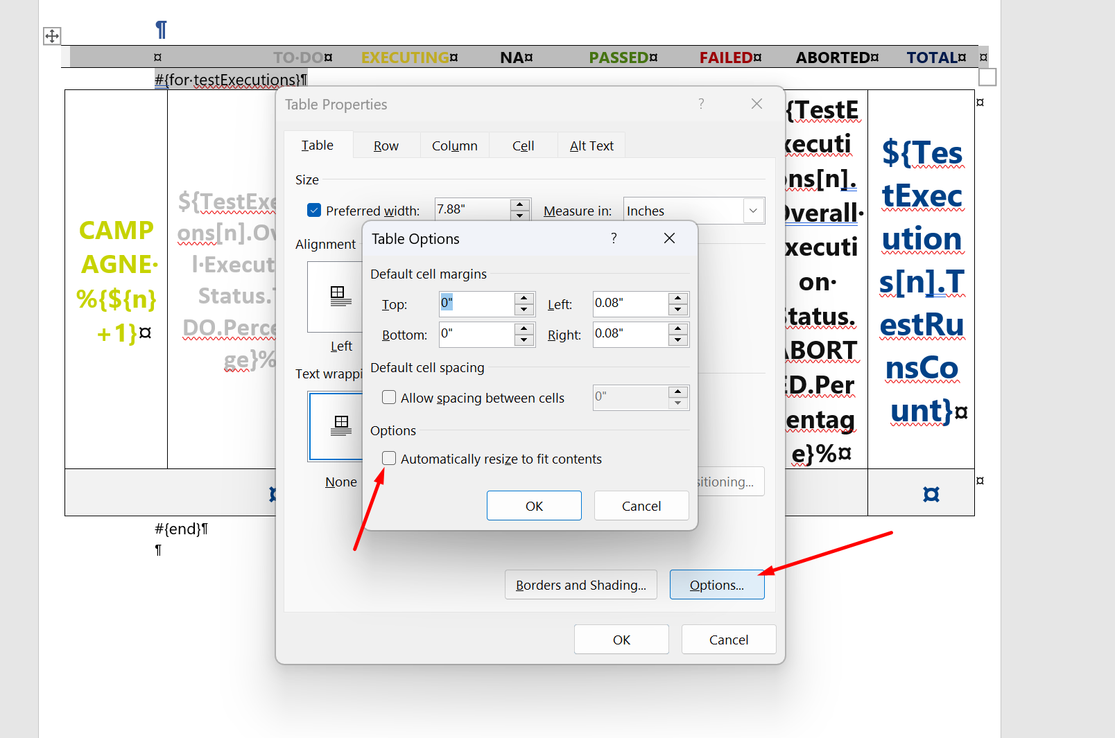 1. Use a template with tables and navigate to Table Properties >> Options and verify the option Automatically resize to fit contents is disabled.