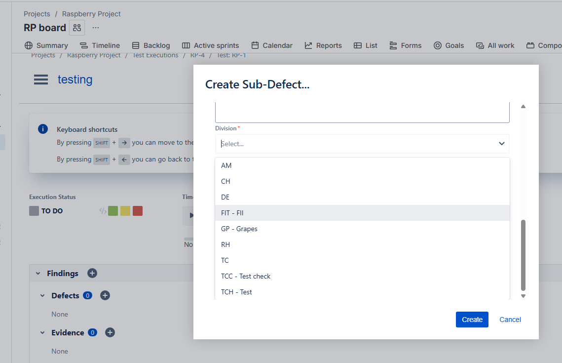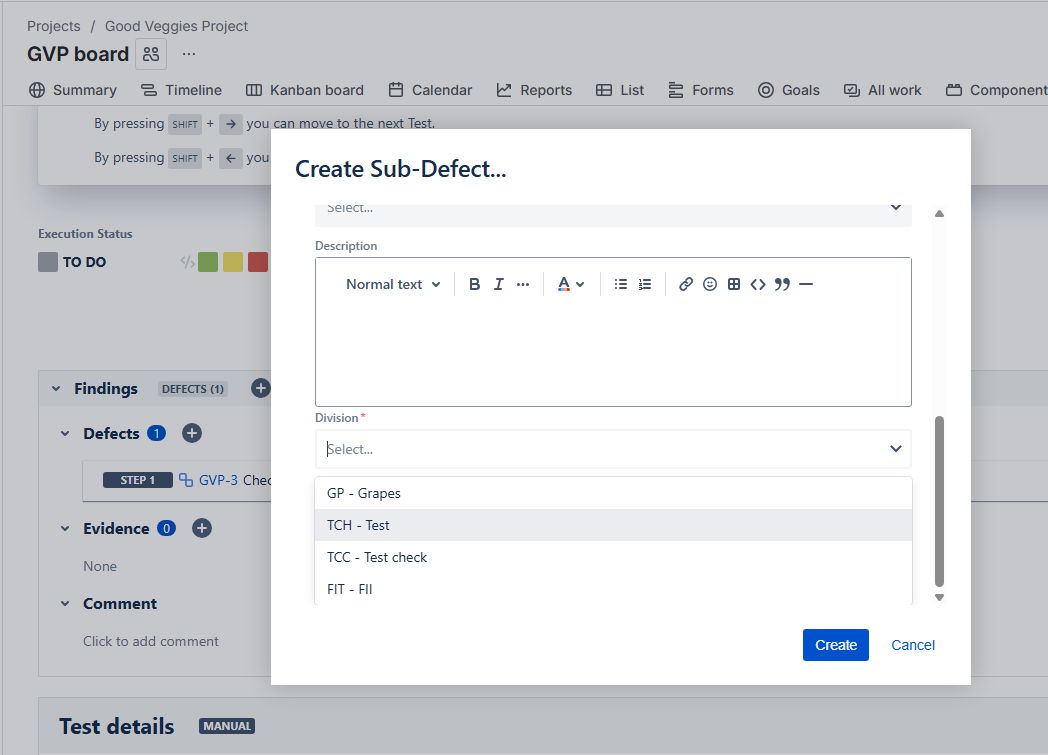 - When heading to the Project, go to a TestRun and create a Sub-Defect, appears the correct context: