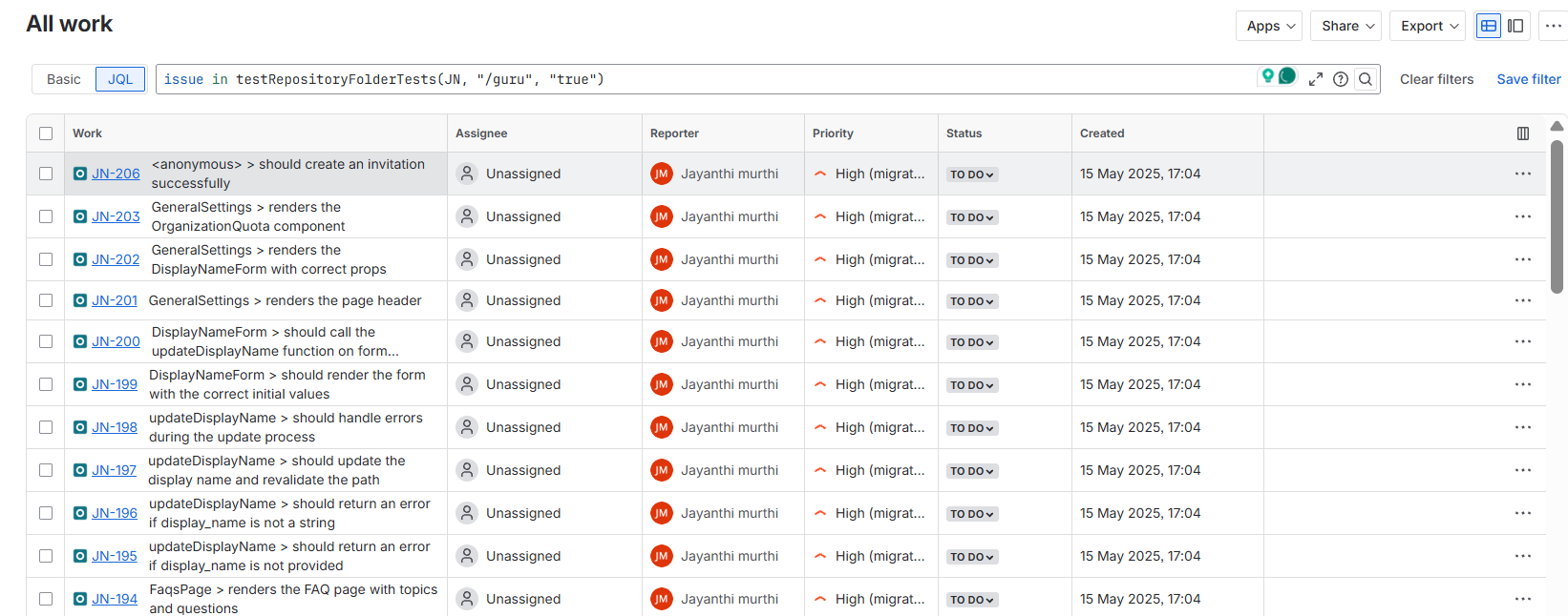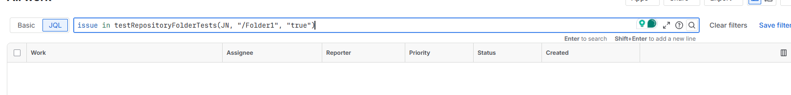 The JQL function testRepositoryFolderTests(), formed from the View Issues in Navigator of the Test Repository, gives inconsistent results. The working change with the placement of the Root folder, and also randomly with case-sensitiveness for characters.