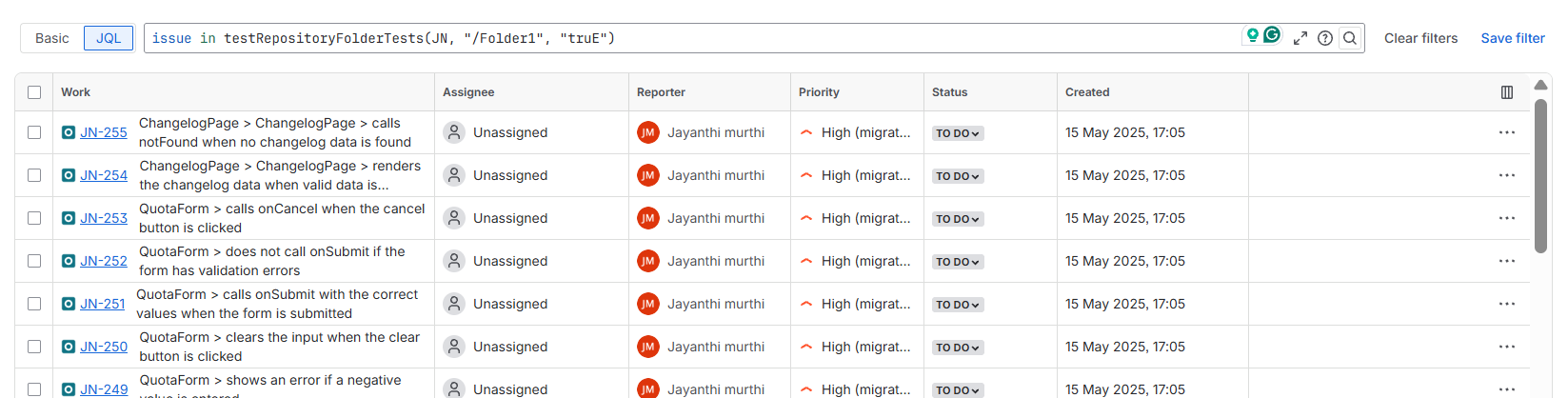 - Right-click on the first root folder and select View Issues in Navigator. It opens a new page with JQL function to view the issues of the folder.