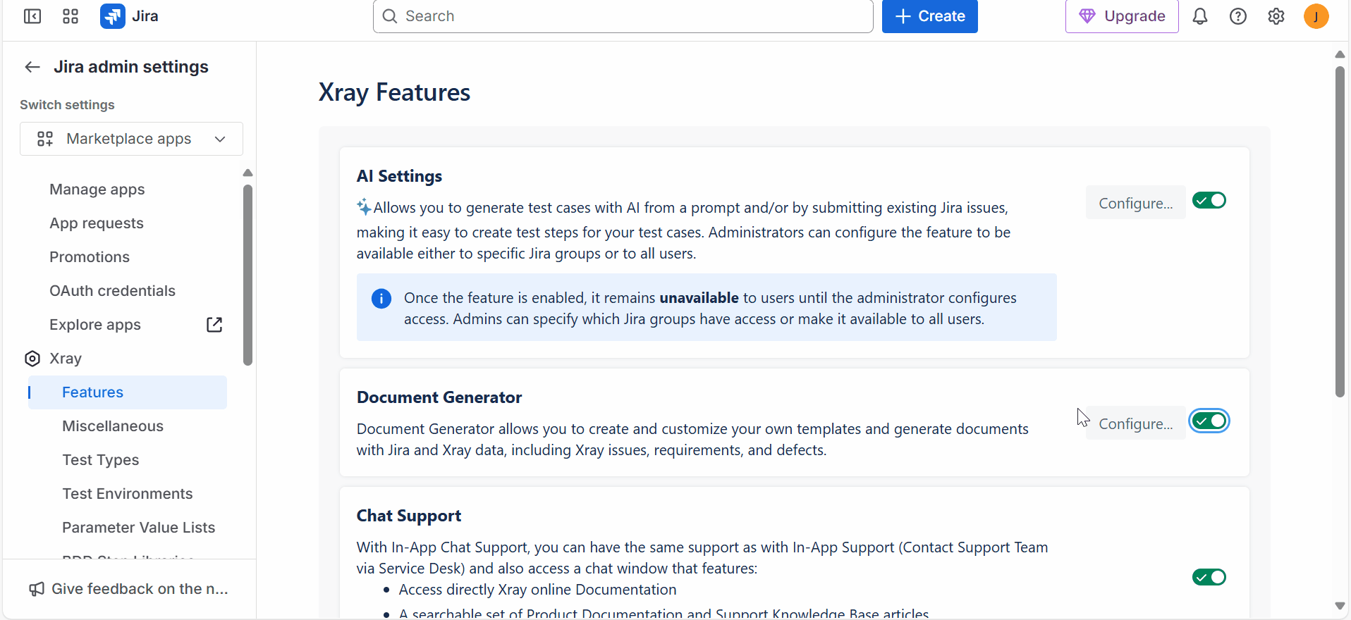 - Navigate to Jira Settings >> Marketplace Apps >> Features(Xray) >> Toggle off Document Generator.