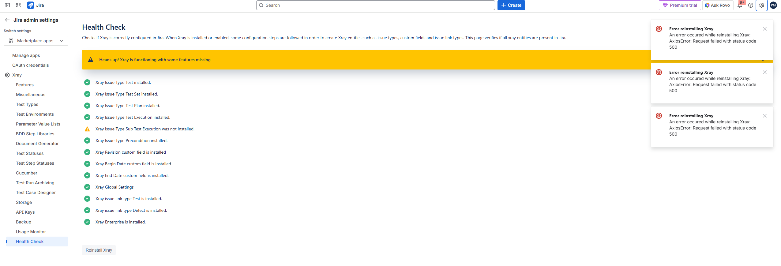 An error occured while reinstalling Xray: AxiosError: Request failed with status code 500