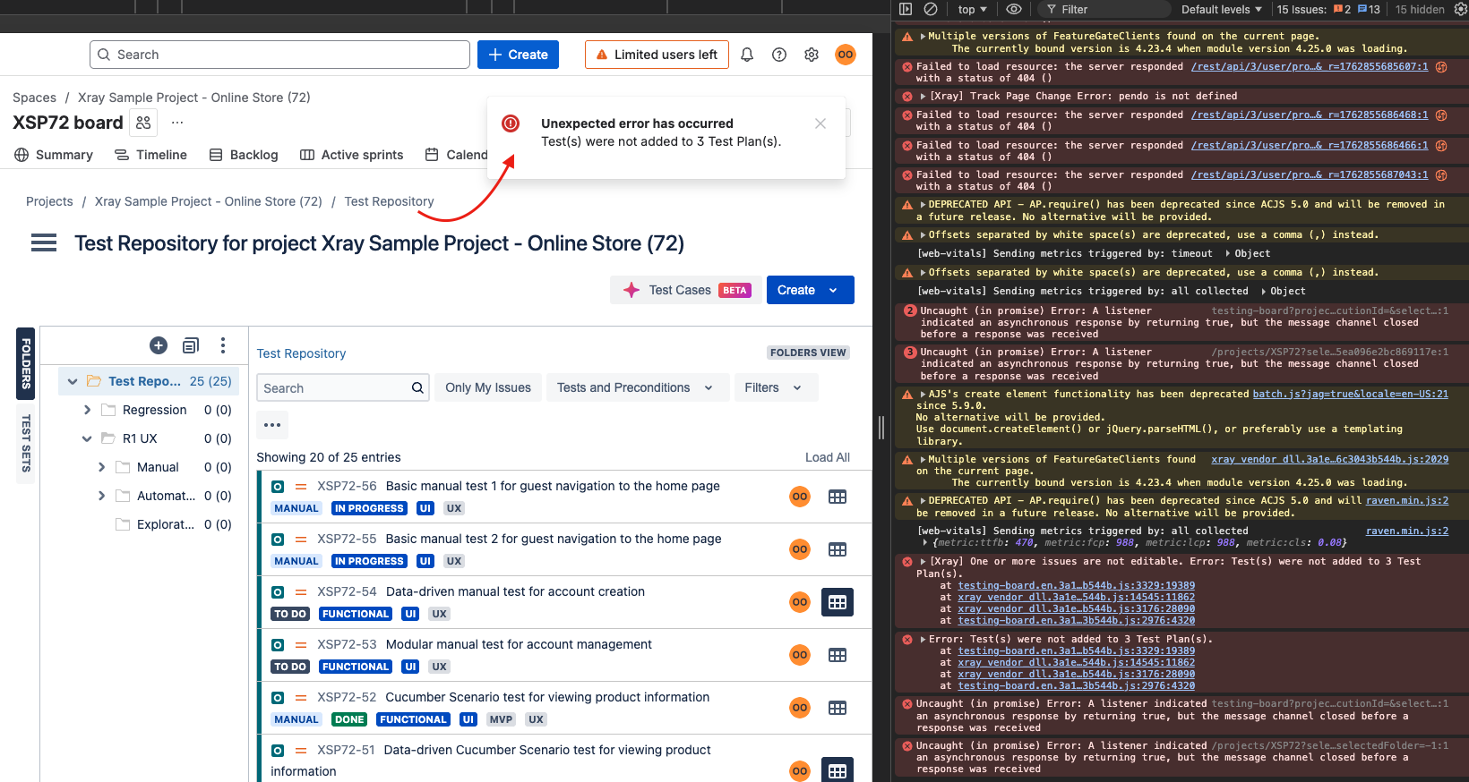 When adding Tests from the Test Repository to a Test Set, Test Plan, or Test Executio using the “Add All” option, the operation fails. An error message is displayed, and the selected Tests are not added to the target entity. However, when the user selects Tests with “Add Selected” option, the Tests are added successfully.