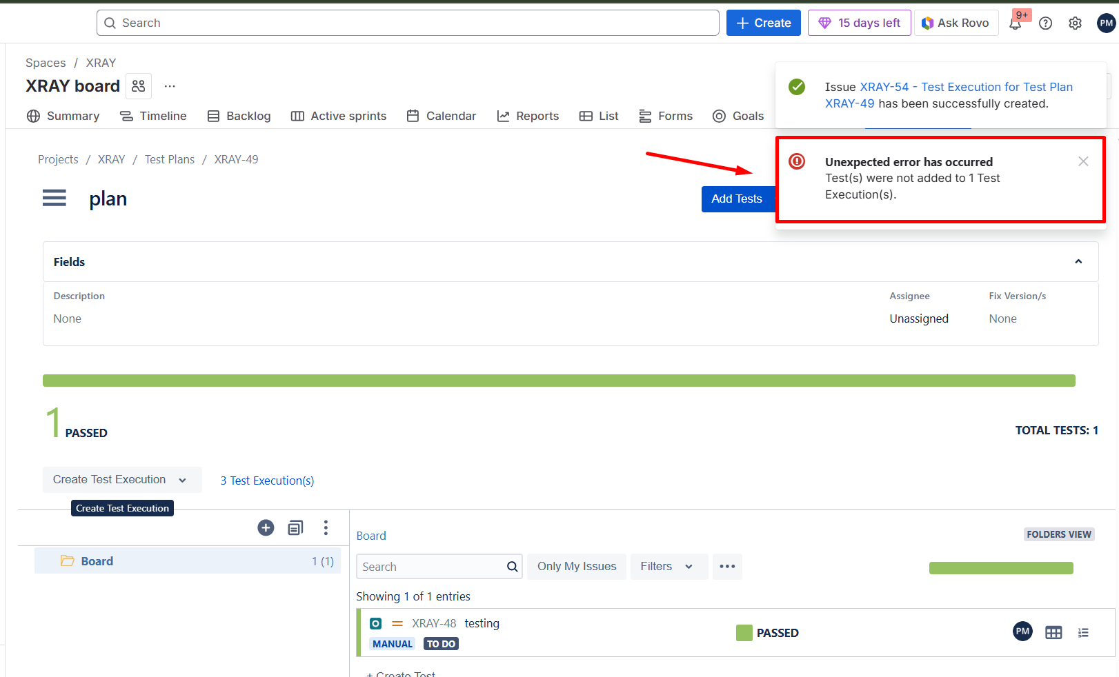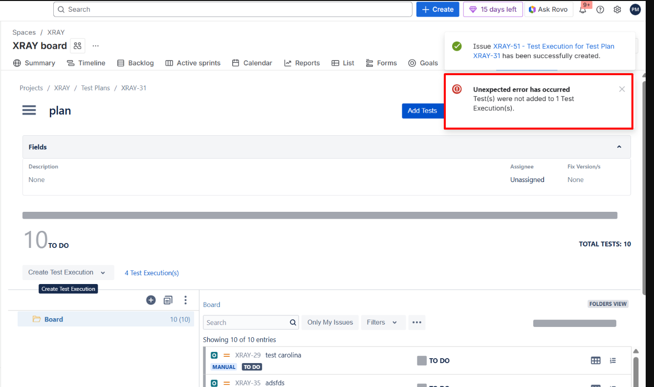 - Then an error toast appears: “Unexpected error has occurred. Test(s) were not added to 1 Test Execution(s).”
