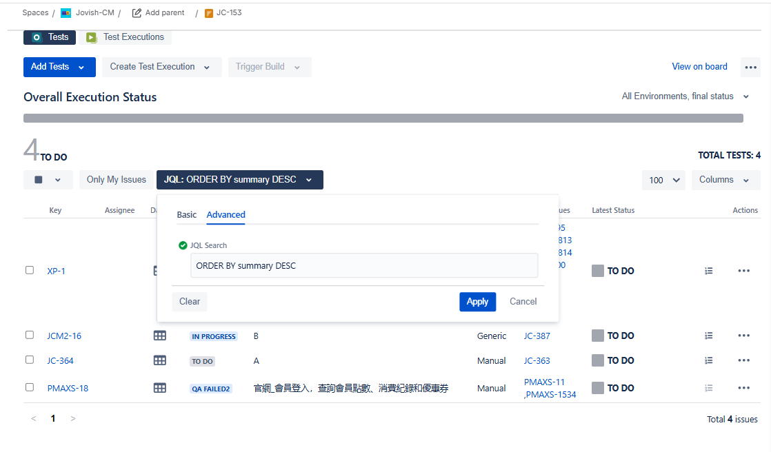 Description: "Order by" JQL filter under Test Plan is not working