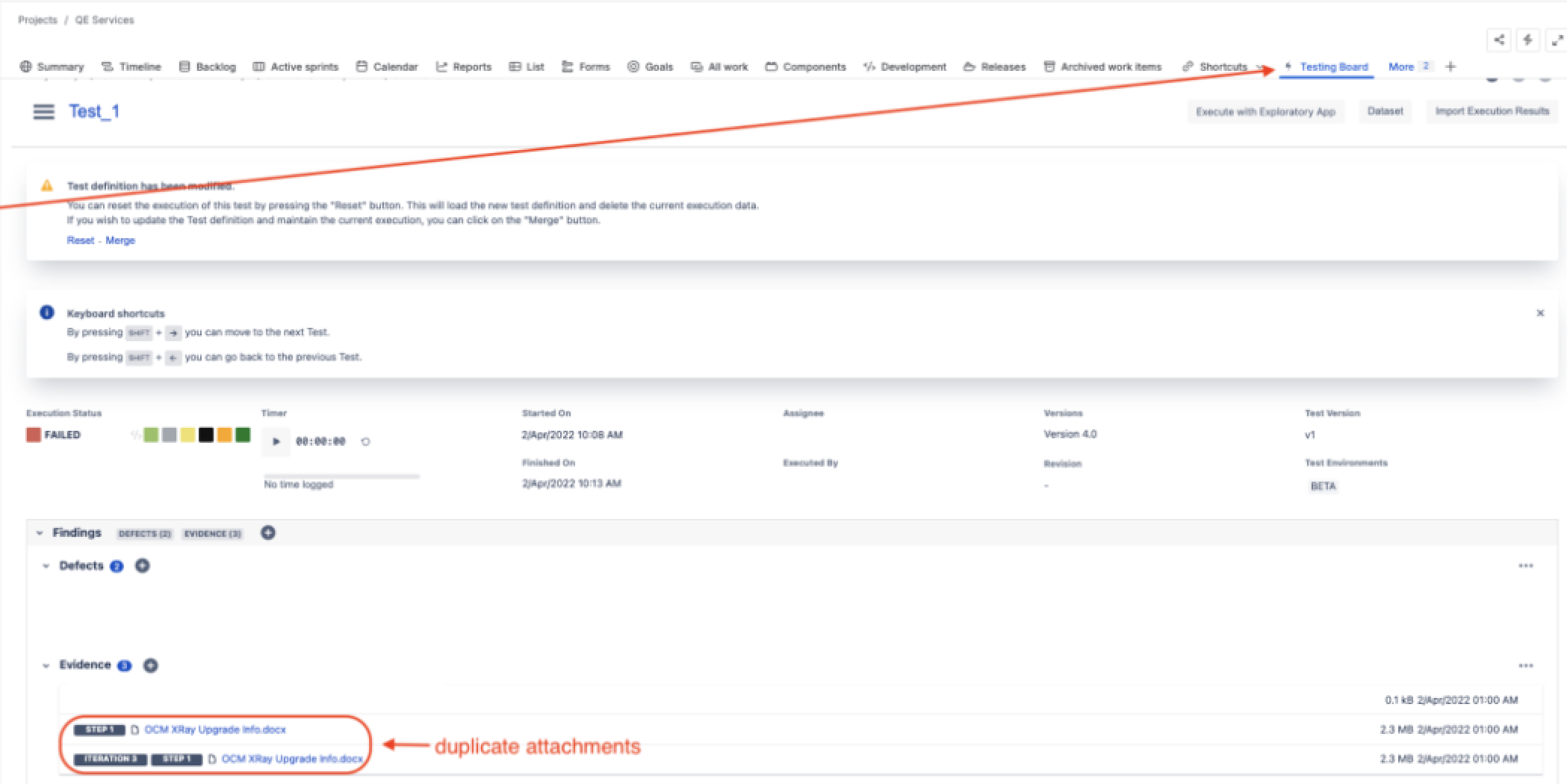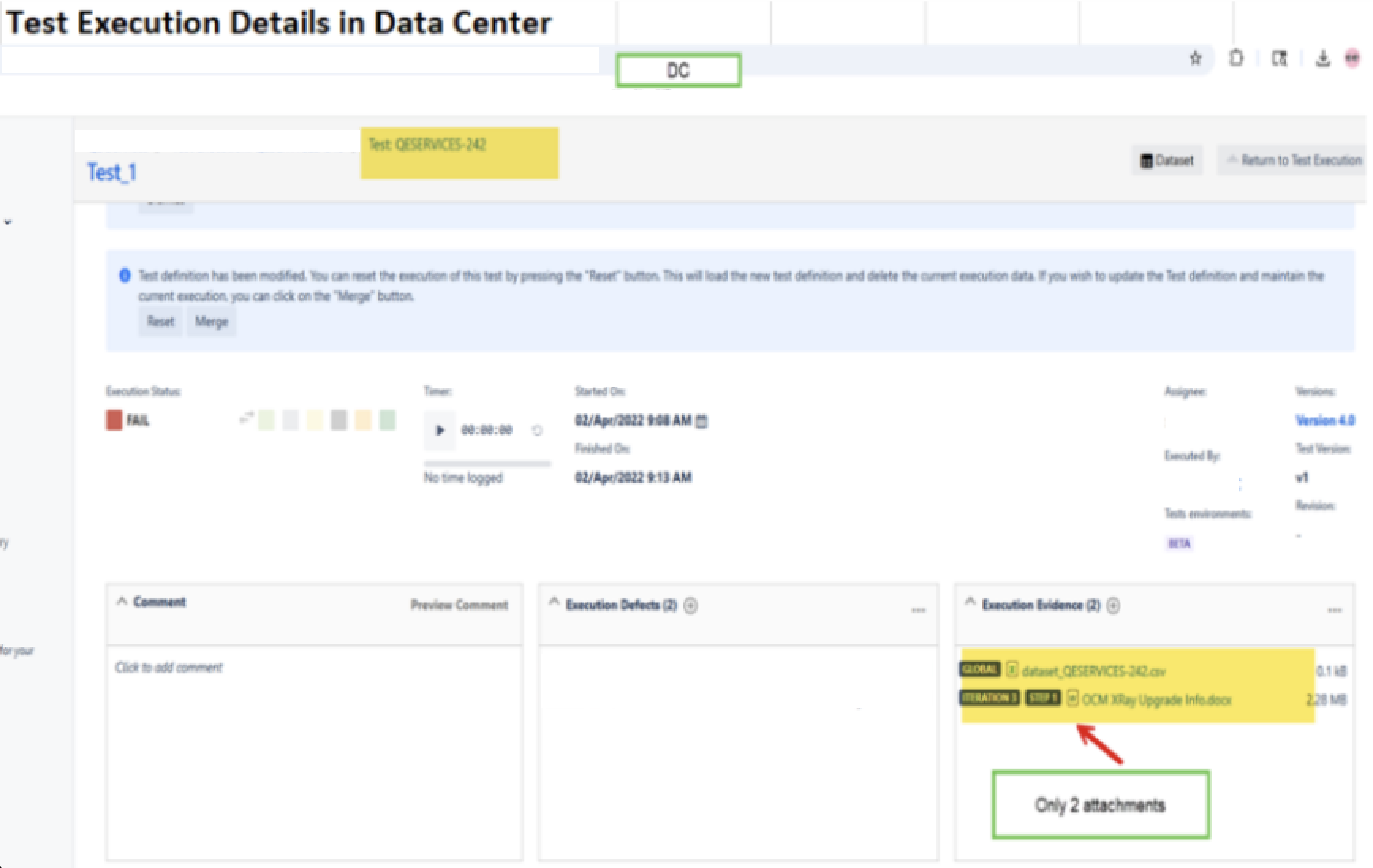 - As a result, the Execution Evidence section of the Test Run should show the attachment only once, and it should be indicated that the attachment belongs to a specific step and iteration (ex.: Iteration 2/Step 1).